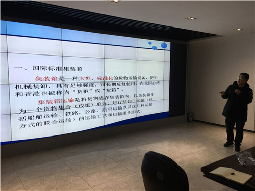圍繞集裝箱的分類、結(jié)構(gòu)、制造材料、發(fā)展現(xiàn)狀和設(shè)備操作等業(yè)務(wù)知識,李宗潭博士展開話題,詳細(xì)闡述。在授課過程中,李宗潭博士通過多媒體的形式,圖文并茂,繪聲繪色,聽眾們?nèi)褙炞?,并不斷做筆錄。