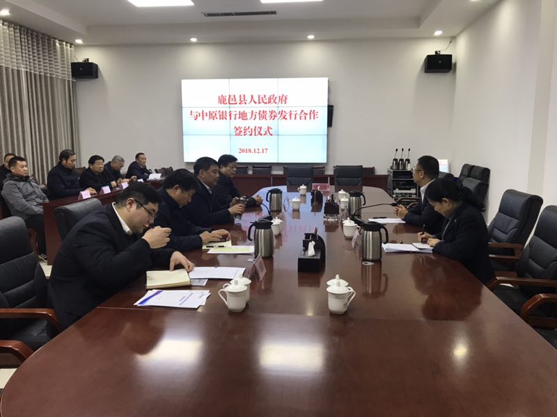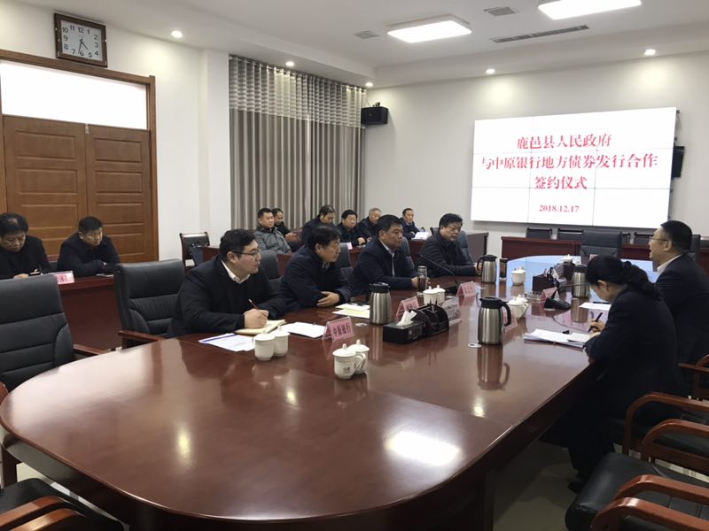 12月17日,鹿邑縣人民政府與中原銀行地方債券發(fā)行合作簽約儀式舉行。縣委常委、常務(wù)副縣長陸志杰,老子學(xué)院黨組副書記、交通局局長王初立,中原銀行周口分行黨委副書記、副行長周朝陽出席簽約儀式。縣財政局、教體局、住建局、林業(yè)局、發(fā)改委、老子文化產(chǎn)業(yè)園及投資公司等相關(guān)單位負(fù)責(zé)同志參加會議。