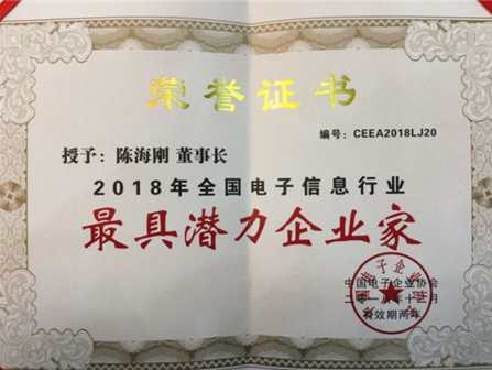 在當(dāng)日下午召開(kāi)的全國(guó)電子信息行業(yè)優(yōu)秀企業(yè)家表彰大會(huì)上,公司董事長(zhǎng)陳海剛榮獲“2018年全國(guó)電子信息行業(yè)最具潛力企業(yè)家”榮譽(yù)稱號(hào)。