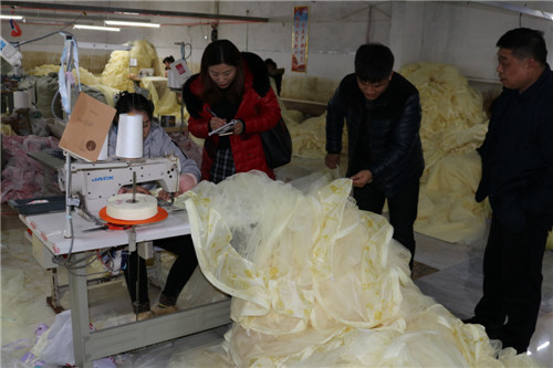 “對于有勞動能力的貧困戶及留守婦女,只要報名一律錄用,根據(jù)個人能力提供合適崗位,免費進(jìn)行業(yè)務(wù)技能培訓(xùn),變‘輸血’變‘造血’;成為熟練工的貧困戶,月收入均可達(dá)到3000元以上。”金凱盛家紡“扶貧車間”位于吳小廟村邊,該公司負(fù)責(zé)人趙開軍是楊湖口鎮(zhèn)走出去打工、在事業(yè)有成后返鄉(xiāng)創(chuàng)業(yè)的一個普通80后,他的公司總部位于江蘇省南通市,像這樣的幾百人加工基地附近有二三家,加工的產(chǎn)品一般是通過天貓、京東等知名電商平臺在全國進(jìn)行銷售,實行網(wǎng)上實行統(tǒng)一下單、就近發(fā)貨,這幾個基地主要負(fù)責(zé)長江以北市場銷售,公司去年年銷售額已突破5000萬元,解決周邊村莊數(shù)千人在門口就業(yè),帶動100多戶貧困戶脫貧。