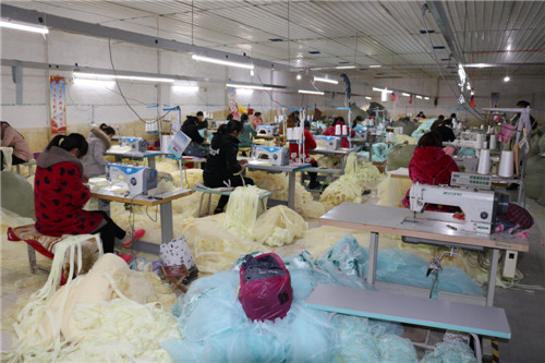 “我以前哪里都沒去過,別說干活掙錢了,公司給我們在家里備了縫紉機(jī),現(xiàn)在可以把活拿到家里做,不出家門,就可以每月掙2000多元,并且常年都有活干。”和王美不一樣的是,貧困戶孫艷紅是因為丈夫去世,留下了她和一個智障兒子相依為命,僅僅依靠兩畝地及親戚鄰居的幫助生活,日子過的很是困苦。在金凱盛家紡“扶貧車間”的幫扶下,孫艷紅如今也順利地摘掉了脫貧帽。當(dāng)天在車間里看到她時,她正準(zhǔn)備拿著需要加工縫制的蚊帳,在家邊干活邊照看兒子。