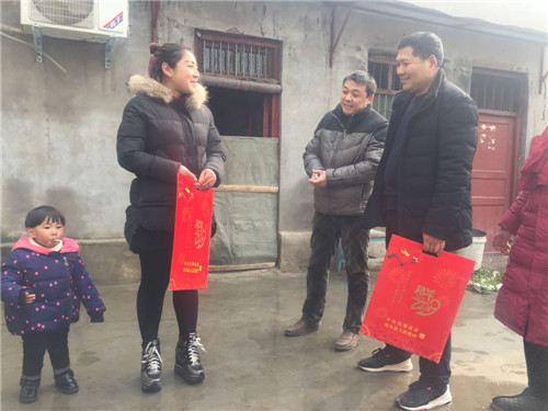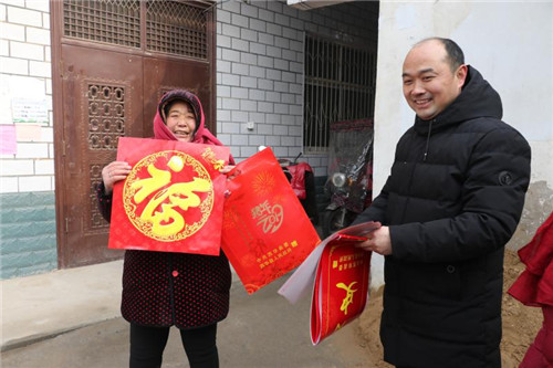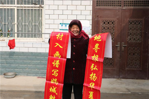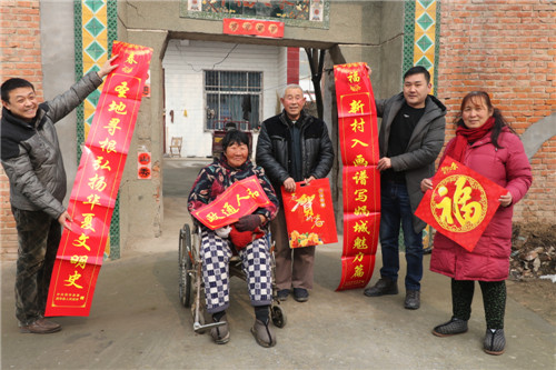 1月16日,西華縣艾崗鄉(xiāng)鐵爐村村民馬永清接過該縣縣委宣傳部駐村扶貧干部送來的春聯(lián)喜上眉梢。據(jù)了解,今年春節(jié)前夕,該縣財政投入200余萬元購置80萬副春聯(lián)在全縣鄉(xiāng)村范圍內(nèi)廣泛開展贈春聯(lián)、送祝福活動。
