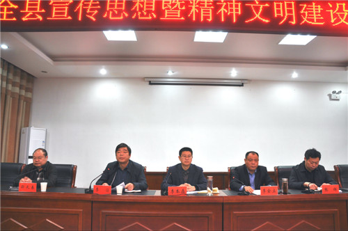 就如何做好今年的宣傳思想和精神文明建設(shè)工作,李本磊要求,要用好“學(xué)習(xí)強(qiáng)國”平臺,強(qiáng)化理論武裝;要建好新時(shí)代文明實(shí)踐中心、鄉(xiāng)村志愿服務(wù)中心、縣級融媒體中心,筑牢基層陣地;要抓好“三城兩縣聯(lián)創(chuàng)”“六村共建”“三個(gè)起來”等三項(xiàng)活動(dòng),普惠人民群眾;要突出工作主線,聚焦主題宣傳;要堅(jiān)持團(tuán)結(jié)鼓勁,營造輿論強(qiáng)勢;要立足凝神聚氣,倡樹文明新風(fēng);要發(fā)揮比較優(yōu)勢,打造文化強(qiáng)縣;要著力增強(qiáng)“四力”,建設(shè)一流隊(duì)伍。