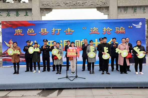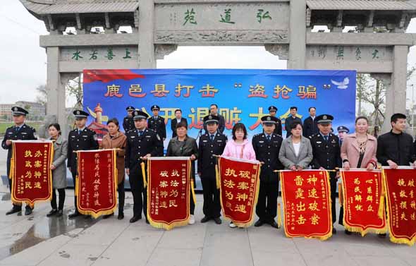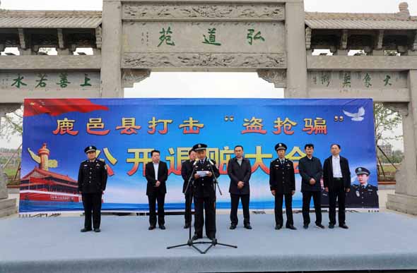 4月25日上午,鹿邑縣召開打擊“盜搶騙”專項行動公開退贓大會??h委常委、政法委書記侯自峰出席會議并講話。縣公、檢、法、司等有關(guān)部門負責(zé)人與群眾代表近300人參加退贓大會。