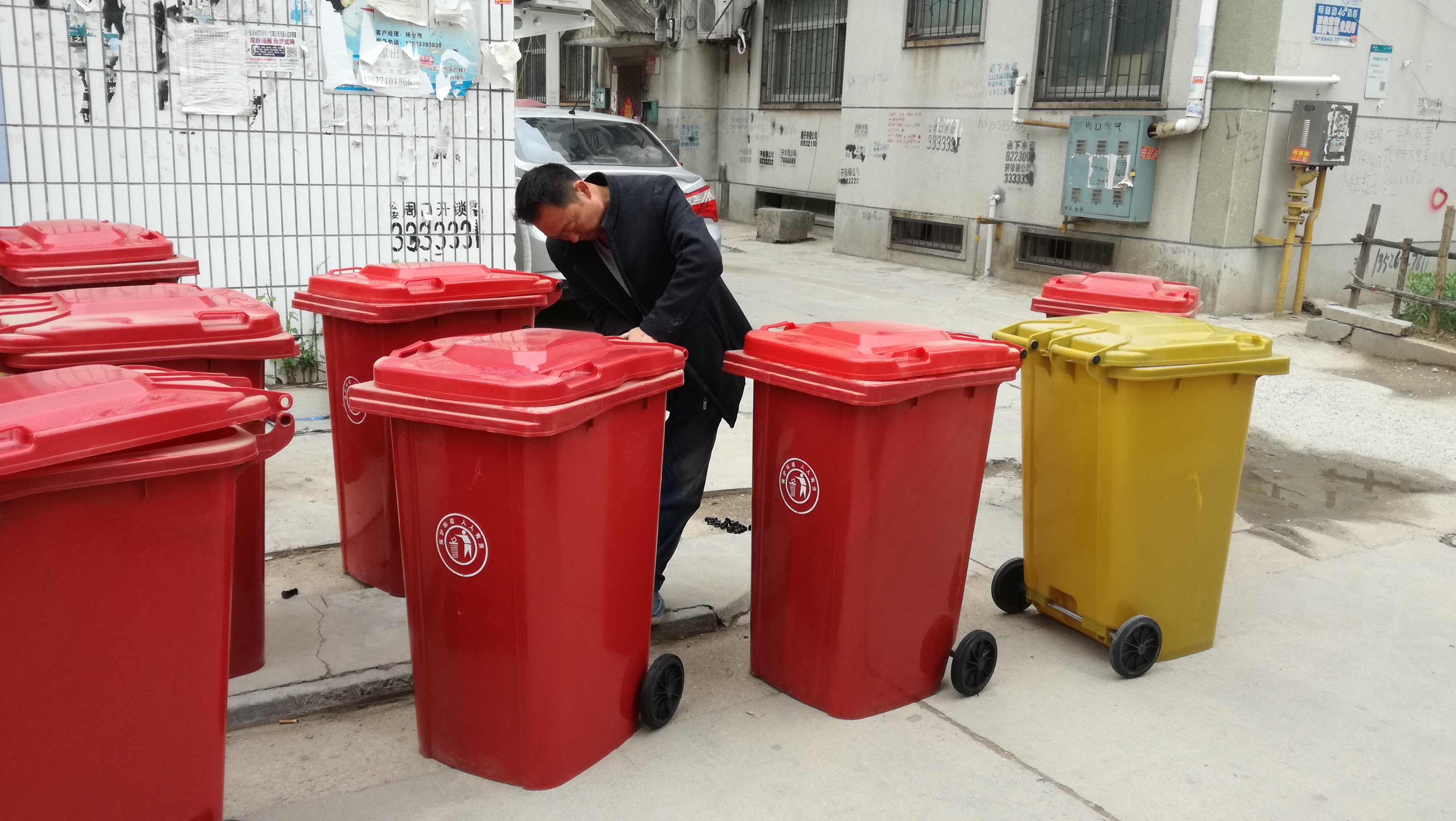 4月25日,在川匯區(qū)七一路辦事處潁河社區(qū)潁河小區(qū)內(nèi),辦事處工作人員按照“創(chuàng)衛(wèi)”標(biāo)準(zhǔn)要求對(duì)該小區(qū)敞開(kāi)式垃圾道進(jìn)行封堵,并配置了移動(dòng)式垃圾桶。 記者 牛思光 攝