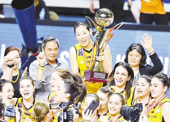 5月5日,瓦基弗銀行隊球員朱婷(中上)邀請父母進(jìn)入球場慶祝奪冠。 當(dāng)日,在2018-2019賽季土耳其女排超級聯(lián)賽決賽第五回合比賽中,瓦基弗銀行隊客場以3比0戰(zhàn)勝伊薩奇巴希隊,以總比分3比2成功衛(wèi)冕聯(lián)賽冠軍。朱婷也蟬聯(lián)了聯(lián)賽MVP(最有價值球員)稱號。 新華社記者 徐速繪 攝
