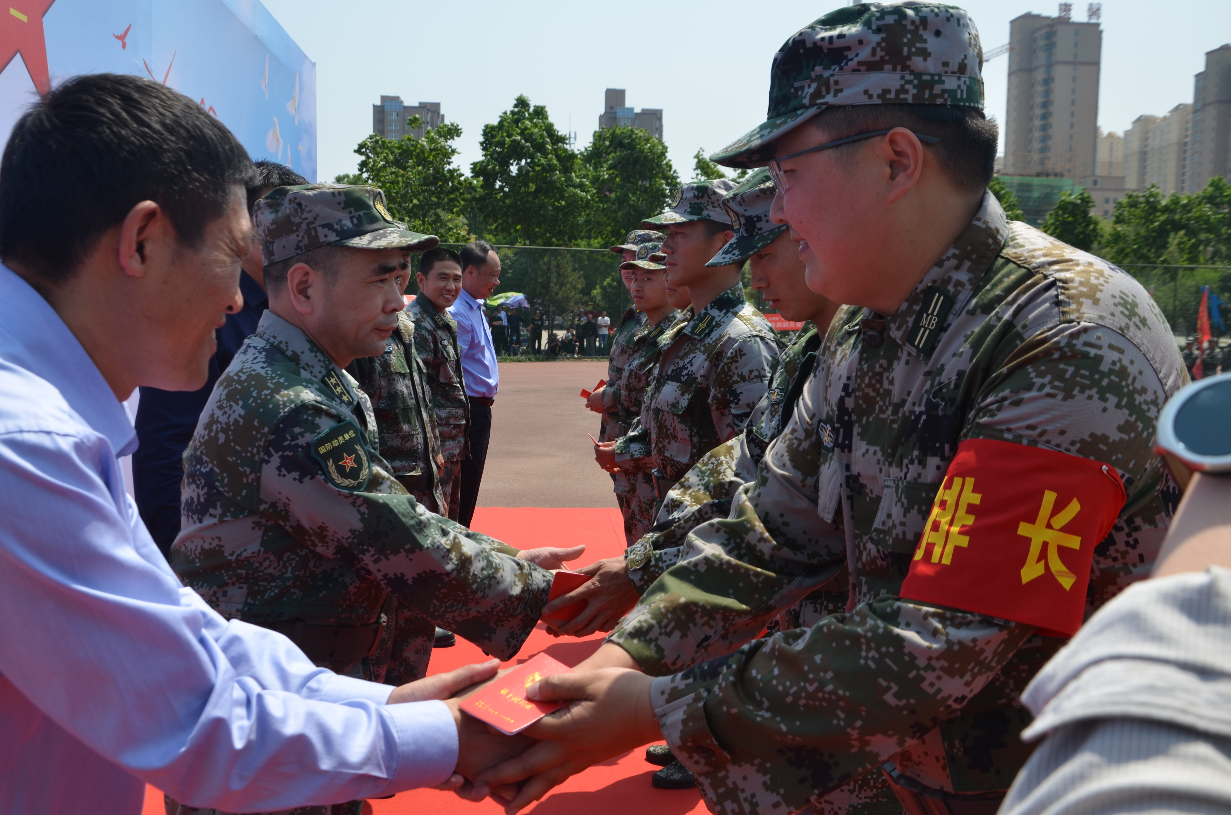 大會在雄壯的《解放軍軍歌》中拉開了序幕。縣委常委、人武部政委曹新旺宣布基干民兵排以上干部任職命令,縣委常委、常務(wù)副縣長郝四春代表縣委、縣政府、縣人武部為基干民兵分隊(duì)授旗,綜合應(yīng)急連指導(dǎo)員、縣人武部政工科長李紅藝帶領(lǐng)全體民兵面對國旗宣讀民兵誓詞。在場領(lǐng)導(dǎo)向民兵代表發(fā)放了基干民兵證和入隊(duì)通知書,民兵代表和教練員代表分別進(jìn)行了表態(tài)發(fā)言。