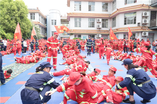 記者在現(xiàn)場看到,數(shù)十名老師分工明確,變身為“消防教官”;千名孩子隊列整齊,成為“小小消防員”;家長則相伴左右,擔任“大大消防員”的角色。演練從“火災”現(xiàn)場撤離拉開序幕,消防健身體操、火場逃生、攀爬通過軟橋、打滾自救、滅火實驗,還有催人淚下的兒童防走失演練“小蝌蚪找媽媽”?!靶◎蝌秸覌寢尅被顒邮亲尯⒆觽儫o人引導的情況下,在所有家長穿著相同、戴著帽子、戴著眼罩的茫茫人海中找爸爸媽媽。
