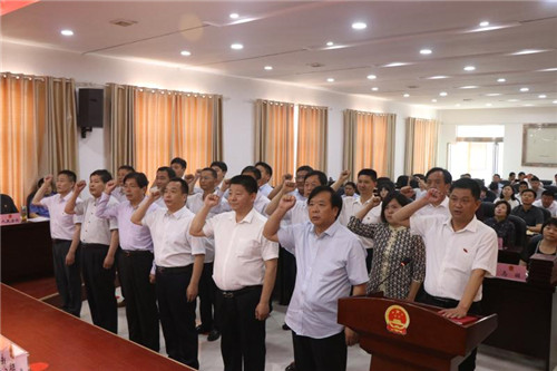 任職人員代表在會(huì)上作了供職發(fā)言。新任命的國(guó)家機(jī)關(guān)工作人員面向國(guó)徽進(jìn)行了憲法集體宣誓,周曉燕為他們一一頒發(fā)了任命書。