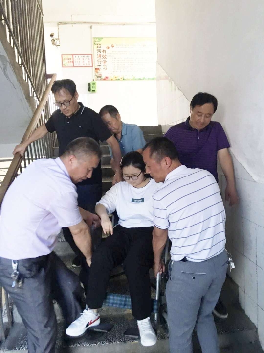 原來(lái),6月22日夜晚,實(shí)驗(yàn)中學(xué)考生晉淼突患急性闌尾炎,住院動(dòng)了手術(shù)后,身體十分虛弱,只得通過(guò)輪椅“行走”。家長(zhǎng)看著心疼,就勸她安心養(yǎng)病,明年再考,但晉淼堅(jiān)持參加考試。25日中考開考首日,晉淼在家人陪護(hù)下,坐著輪椅來(lái)到實(shí)驗(yàn)中學(xué)考點(diǎn)。由于規(guī)定考生家長(zhǎng)不得進(jìn)入考場(chǎng),實(shí)驗(yàn)中學(xué)考點(diǎn)負(fù)責(zé)人商議后決定,由學(xué)??紕?wù)人員承擔(dān)把她抬進(jìn)考場(chǎng)的“任務(wù)”。“孩子交給我們,您就放心吧?!蓖惶нM(jìn)考場(chǎng)的女兒,晉淼的家人欣慰地笑了。