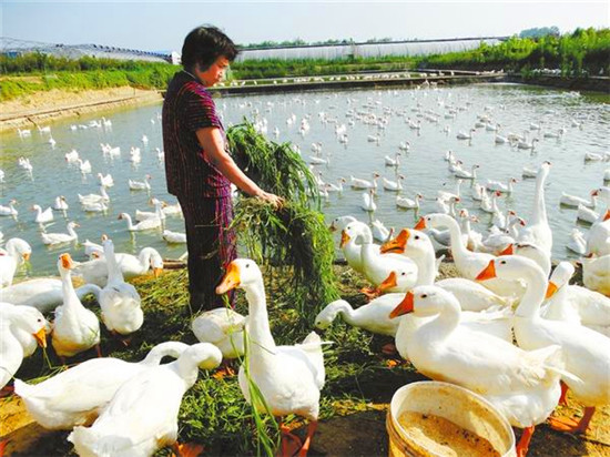7月16日,沈丘縣周營(yíng)鎮(zhèn)馬營(yíng)村生態(tài)鵝養(yǎng)殖基地,工人正在喂養(yǎng)生態(tài)鵝。近年來(lái),該鎮(zhèn)充分利用得天獨(dú)厚的生態(tài)環(huán)境優(yōu)勢(shì),積極引導(dǎo)群眾發(fā)展訂單生態(tài)土雞、肉鵝、槐山羊等特色養(yǎng)殖產(chǎn)業(yè),全力促進(jìn)農(nóng)民增收致富。謝辛凌 攝