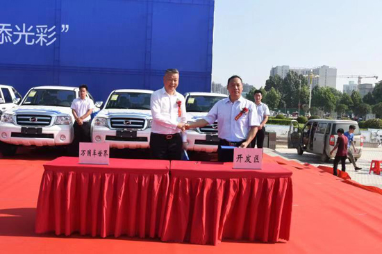 活動現(xiàn)場,由周口市汽車服務(wù)行業(yè)商會會長、萬國車世界董事長呂輝同志與周口經(jīng)濟(jì)開發(fā)區(qū)城管稽查大隊(duì)隊(duì)長郭忠斌同志在簽約臺進(jìn)行車輛捐贈儀式的簽約,并現(xiàn)場進(jìn)行了捐贈車輛交接。