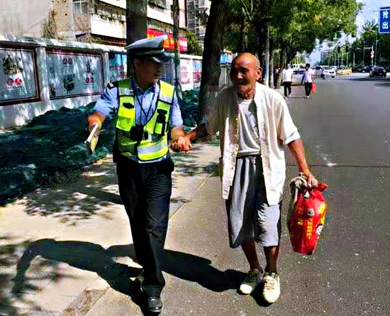 畢鵬發(fā)現(xiàn)這一情況后,立即上前攙扶老人,路過(guò)的車輛看到這一幕也紛紛停車讓行。在安全通過(guò)馬路后,老人告訴畢鵬,他找不到公交車站,無(wú)法回家。隨后,畢鵬手挽手將老人送到公交車站(如圖)。待老人安全坐上公交車后,畢鵬才回到工作崗位上。