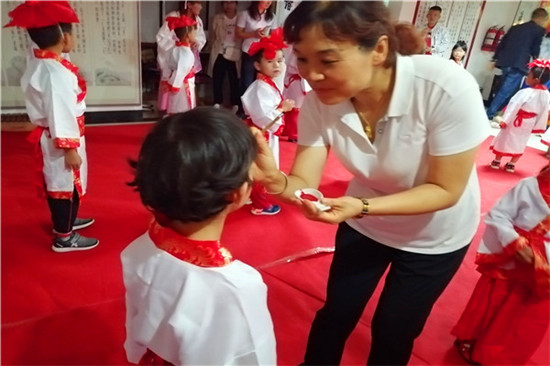 活動(dòng)包含“朱砂開智”、誦讀《弟子規(guī)》、“擊鼓明志”、書畫展示、感恩五個(gè)環(huán)節(jié):第一個(gè)環(huán)節(jié)老師為孩子“朱砂開智”。用朱砂為剛剛?cè)雽W(xué)的孩子在額頭正中點(diǎn)上紅痣,又稱之為“開天眼”。寓意著孩子從此心明眼亮,好讀書、讀好書。第二個(gè)環(huán)節(jié)老師帶領(lǐng)大家誦讀《弟子規(guī)》。孩子們在老師及社區(qū)工作人員帶領(lǐng)下誦讀國學(xué)經(jīng)典《弟子規(guī)》,一起感受儒家經(jīng)典的道德教化魅力。第三個(gè)環(huán)節(jié)是“擊鼓明志”。擊鼓明志是結(jié)合中國傳統(tǒng)文化,讓孩子們通過擊打中國鼓,以鼓聲的清脆悅耳,來提高孩子的精氣神,激發(fā)孩子們的斗志,給孩子們建立濟(jì)世救人,胸懷天下的抱負(fù),從而也讓孩子們表達(dá)出人生理想,為未來的人生目標(biāo)努力奮斗?!拔议L大想當(dāng)一名醫(yī)生,可以治病救人……我長大想當(dāng)一名消防員,在著火的時(shí)候奔赴火場救人……我長大想當(dāng)一名古箏老師,登上世界舞臺彈奏好聽的音樂……”孩子們依次擊鼓并說出了人生理想抱負(fù)。第四個(gè)環(huán)節(jié)是書畫展示。繪畫創(chuàng)作讓孩子們靜定心靈,激發(fā)智慧。第五個(gè)環(huán)節(jié)是感恩環(huán)節(jié),感恩老師、感恩父母、感恩天地萬物,以此培養(yǎng)孩子們向善向上的健康思想,增強(qiáng)他們的社會(huì)責(zé)任感,進(jìn)一步引導(dǎo)他們常懷感恩之心。