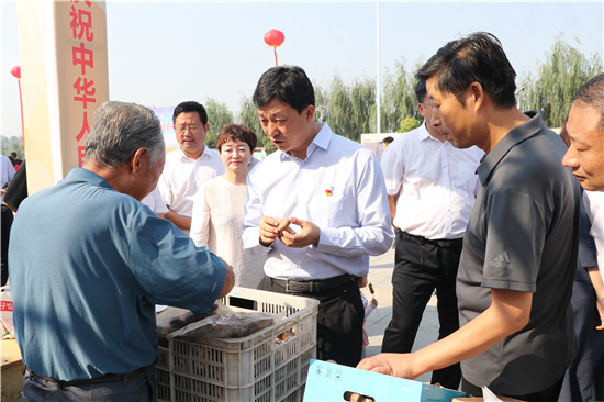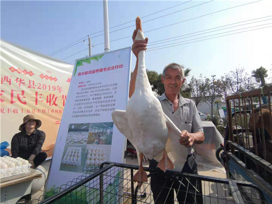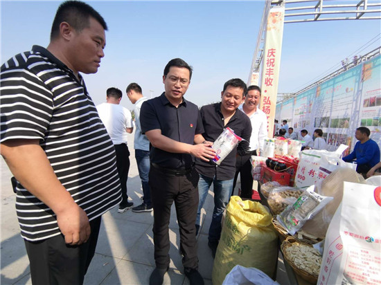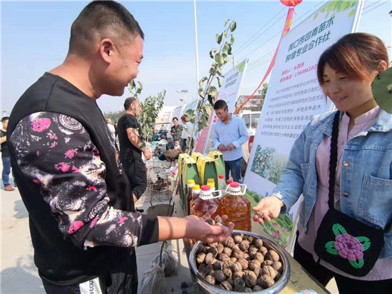 一問一答間,爽朗的笑聲響徹節(jié)日上空,農(nóng)民們喜笑顏開,傳遞出濃濃的幸福。大棗、黑木耳、小麥粉、粉條等西華縣各具特色的農(nóng)產(chǎn)品紛紛亮相,除了展示各自的“增收實(shí)力”,也展示出幾年來發(fā)展農(nóng)業(yè)特色經(jīng)濟(jì)的豐碩成果?!罢钆_(tái),農(nóng)民唱戲,每年一度的農(nóng)民豐收節(jié)既是農(nóng)民歡樂的節(jié)日,也是展銷農(nóng)產(chǎn)品的紐帶平臺(tái),今天我們奉母鎮(zhèn)展示了本地原生態(tài)粉條和純糧美酒,希望借助豐收節(jié)機(jī)遇,拓寬銷路實(shí)現(xiàn)農(nóng)民增收?!蔽魅A縣奉母鎮(zhèn)黨委書記陳鵬告訴記者。