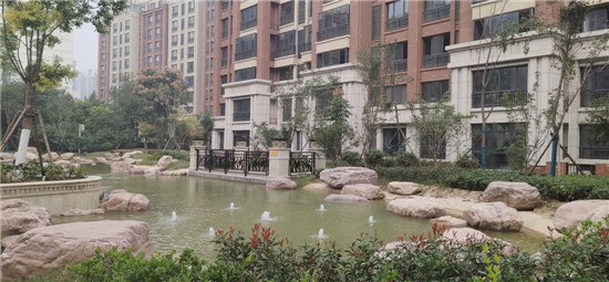 在九號院小區(qū),記者看到,地面用水沖洗得干干凈凈,院內假山噴泉,小河潺潺流水,讓人置身其中,如在畫中游覽。