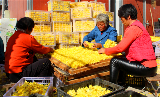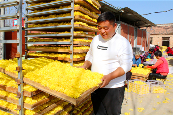 眼下,正值菊花盛開時節(jié),西華縣鑫豐菊花種植專業(yè)合作社160余畝菊花美不勝收,金黃色的菊花一望無際,清香撲鼻,令人陶醉。此時,在鑫豐合作社菊花烘干車間旁,數十位村民正挑揀、擺放菊花,歡聲笑語,好不熱鬧。