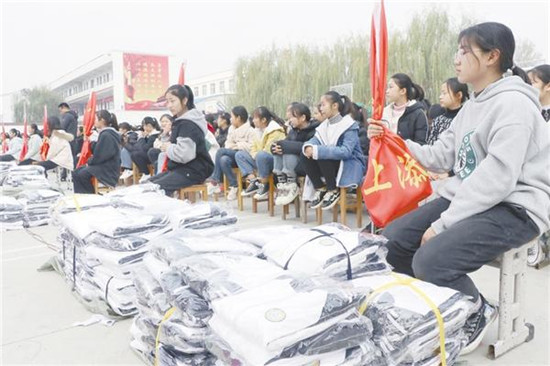 當日上午,太康縣毛莊鎮(zhèn)一中1800多名學生圍坐在操場上,看著面前碼放整齊的新校服,十分激動(如圖)。捐贈儀式開始后,太康萬城商貿董事長陳家濟等愛心人士,為學生挑選、試穿新校服。同學們抱著新校服,向好心的叔叔道謝。
