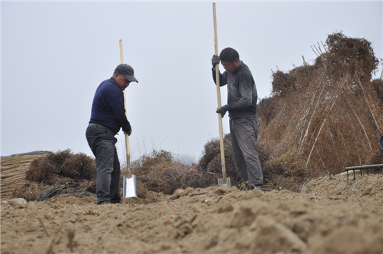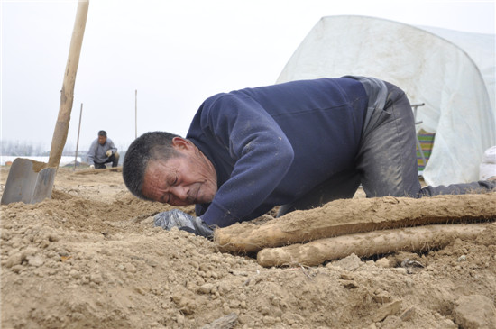 他從最早用尖頭鋼鍬開(kāi)始,逐漸改為扁頭鋼鍬,再改用目前的鋼筒鍬。耿金中說(shuō),挖山藥是一個(gè)體力活,也是一項(xiàng)技術(shù)活,挖山藥多少跟個(gè)人技術(shù)熟練程度有關(guān),因?yàn)樯剿幒艽啵昧Ψ执?、下鍬角度及深淺不合適都易造成山藥折斷,影響品質(zhì)。