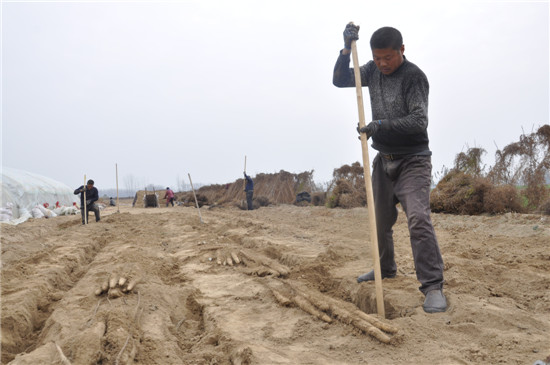 11月26日,沈丘縣白集鎮(zhèn)40多歲的耿金中與另外兩個(gè)同伴一起來(lái)到周口城鄉(xiāng)一體化示范區(qū)許灣鄉(xiāng)肖王莊,未來(lái)的一段時(shí)間,他們吃住都將在這里進(jìn)行,直到將這一區(qū)域的山藥挖完。耿金中說(shuō),他挖山藥已經(jīng)有20多年了,20多年前,沈丘縣大規(guī)模種植山藥,每到收獲時(shí),會(huì)有很多山東挖山藥工人來(lái)這里挖山藥。他看到這個(gè)行當(dāng)能賺錢(qián),就開(kāi)始學(xué)挖山藥技術(shù)。此后的多年,他先后到山西、湖北、安徽等地挖山藥。