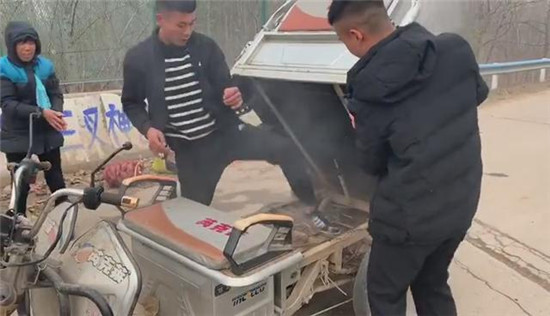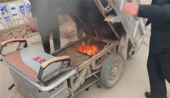 “當(dāng)時(shí)在我們前方的一輛電動(dòng)三輪車駕駛座下冒出黑煙,車上兩位老人察覺到危險(xiǎn)后,急忙下車,站在一旁不知所措。我們也緊跟上前。事發(fā)突然,現(xiàn)場沒有滅火器和可利用水源,而三輪車的火越來越大,兩位老人著急萬分,在旁邊不停地請求我們幫幫她們。根據(jù)經(jīng)驗(yàn),我們當(dāng)機(jī)立斷利用路邊的泥土進(jìn)行撲救,經(jīng)過幾十秒的緊張撲救,著火部位被成功撲滅?!比幌狸?duì)員回憶說三輪車是電線短路引起的電瓶著火。