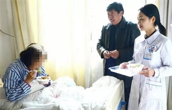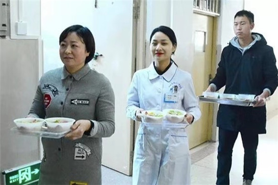 餃子煮好,盛入碗內(nèi),端入病房,親手送到患者手中,看到患者品嘗餃子時的開心樣子,醫(yī)護(hù)人員從心里笑到了臉上。