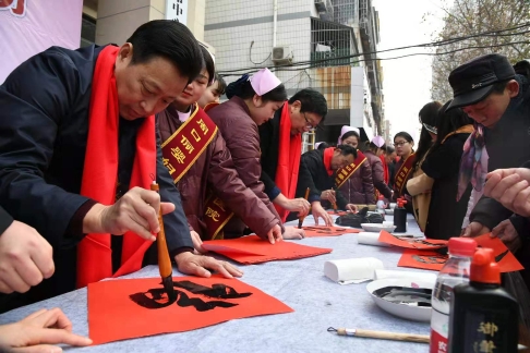 18日上午9時(shí)30分,位于新建街的周口儷嬰婦女兒童醫(yī)院門前喜氣洋洋,張燈結(jié)彩,熱鬧非凡,儷嬰婦女兒童醫(yī)院邀請(qǐng)市書協(xié)、川匯區(qū)書協(xié)的書法家們,在門前為“送福送健康暨書法家義寫春聯(lián)”活動(dòng)舉行了簡短的儀式,隨即活動(dòng)展開,一邊是儷嬰婦女兒童醫(yī)院的專家們將坐診臺(tái)搬到門前,細(xì)致地為來往的居民免費(fèi)量血壓、把脈等義診,一邊擺下10多張桌子和筆墨紙硯,中國書協(xié)會(huì)員游保峰,著名書法家、川匯區(qū)書協(xié)終身名譽(yù)主席李大慶,書法家馮干敏、李輝、李國斌及川匯區(qū)書協(xié)主席李尊杰,市書協(xié)副主席劉廣巖,川匯區(qū)書協(xié)副主席兼秘書長杜忠義,副主席曾祥峰、何楠,著名書法家寇成義等書法家們,展開大紅的紙張,揮毫潑墨,飄著墨香的福字和一對(duì)對(duì)大紅的春聯(lián),帶著新春的祝福,送到居民手里,一波波居民到自己喜愛的書法家面前,喜討福字和春聯(lián),開心的喜悅洋溢著臉上……