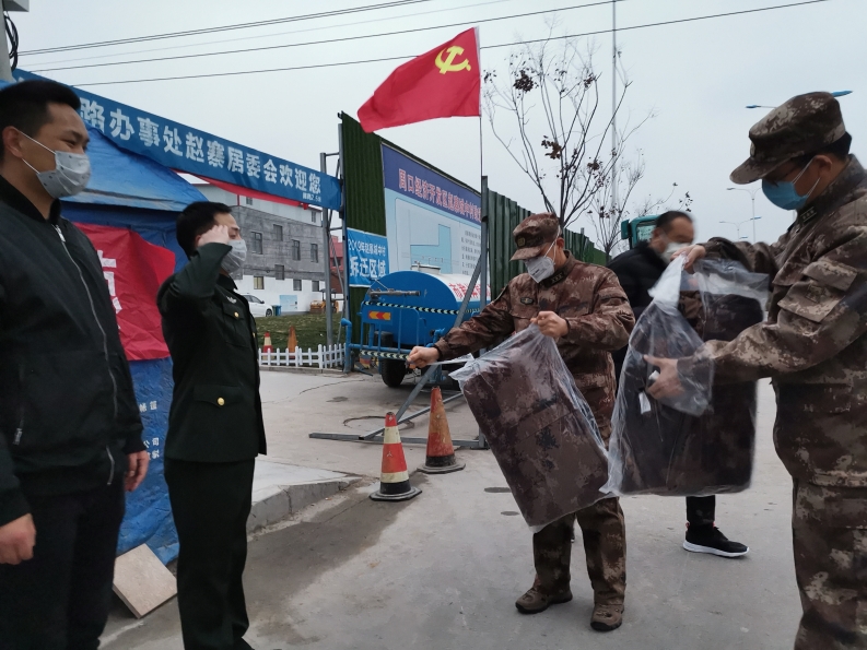 在淮河路辦事處趙寨居委會執(zhí)勤點(diǎn),探親在家兩名現(xiàn)役戰(zhàn)士趙為為、趙繼周疫情發(fā)生后堅持在防控一線執(zhí)勤點(diǎn)執(zhí)勤。當(dāng)晚6時許,天色漸黑,了解到這一情況后,部長和政委依然驅(qū)車趕到現(xiàn)場,詳細(xì)了解兩名戰(zhàn)士的服役情況,并給他倆每人送了一件軍用大衣,提醒注意自身安全,有啥需求第一時間和武裝部溝通聯(lián)系。
