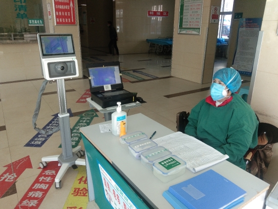 2月18日,記者在周口市中心醫(yī)院急診科看到,一臺醫(yī)用紅外熱像儀出現(xiàn)在急診科的大門口,前來就診的患者必須通過該熱像儀的檢測才能進入急診科就診?!扒皝砭驮\的患者只需要在熱像儀前經(jīng)過,熱像儀就會在屏幕上自動顯示患者的體溫信息,一旦出現(xiàn)體溫偏高的人,熱像儀就會自動報警,并不需要人工檢測,提高了檢測效率?!痹谠摕嵯駜x前做紀(jì)錄的醫(yī)務(wù)工作者說。 記者 張洪濤 攝