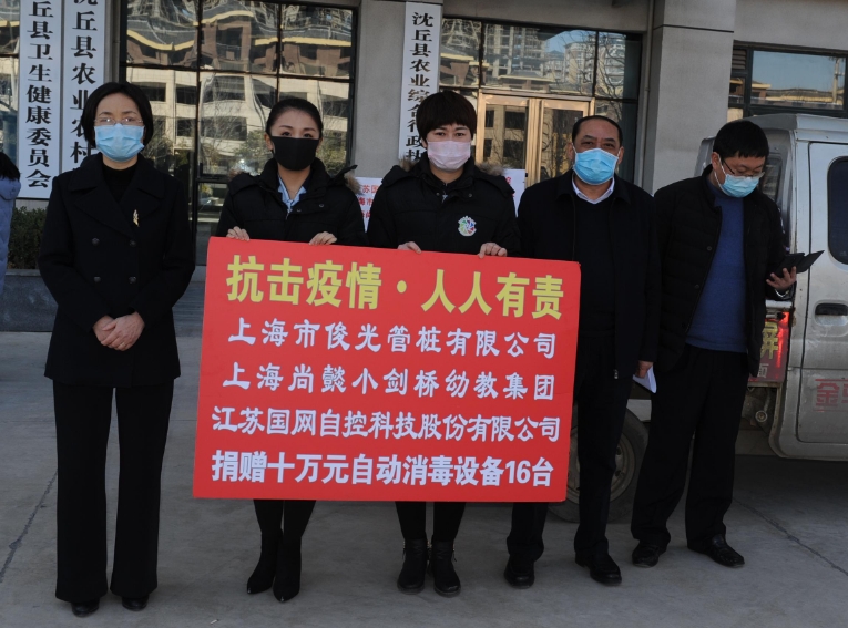 2月18日,在沈丘縣疫情防控指揮部,上海市俊光管樁有限公司、江蘇國網(wǎng)自控科技股份公司、上海上懿小劍橋教育管理有限公司聯(lián)合捐贈價值10萬元的自動消毒設(shè)備16套,沈丘縣洲業(yè)車業(yè)有限公司(洲業(yè)國際汽車城)捐贈84消毒液(10升/桶)17桶、(5升/桶)166桶,沈丘縣華順農(nóng)業(yè)建設(shè)工程有限公司捐贈75%酒精消毒液(非醫(yī)用)(2.5L/桶x6/件)168件、一次性使用醫(yī)用橡膠檢查手套(100副/盒)53盒,用于疫情防控工作??h委常委、縣政府黨組成員馬偉,縣政協(xié)副主席、縣工商聯(lián)主席張瑛,縣政府辦副主任韓向立出席捐贈儀式。