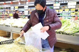 上午9時許,許新衛(wèi)把微信上的“菜譜”抄到紙上,然后開著他的五菱宏光面包車,來到村北頭的好又多購物廣場。記者看到,購物廣場門口的工作人員對每一名進入超市的人員都要進行體溫檢測。進入購物廣場內(nèi)部,市場內(nèi)物資充足、品種齊全、擺放有序,所有人員都戴著口罩。前來購物的大多是附近的村民。