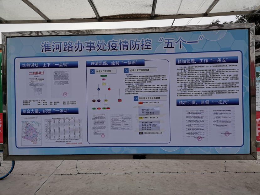 淮河路辦事處地處我市東南部,總?cè)丝诩s4萬。轄區(qū)黃灘、孟營(yíng)、鄭洼、牛灘、劉新莊、姚灘、南徐、路莊、趙寨、麥仁店、康樓、徐莊等12個(gè)居委會(huì),有34個(gè)自然村,114個(gè)村民組,人口約39000人、面積20平方公里。根據(jù)轄區(qū)的實(shí)疫情防控工作,淮河路辦事處探索出一套疫情防控工作“五個(gè)一”流程。統(tǒng)籌謀劃,上下“一盤棋”; 整合力量,織密“一張網(wǎng)”; 理清思路,繪制“一幅圖”;精細(xì)管理,工作“一條龍”;精準(zhǔn)問責(zé),監(jiān)督“一把尺”。
