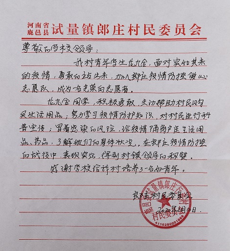 “龍九合同學(xué)積極勇敢,主動(dòng)幫村民購買生活用品,努力學(xué)習(xí)疫情防護(hù)知識(shí),對(duì)村民進(jìn)行科普宣傳,冒著感染的風(fēng)險(xiǎn)給疫情隔離戶送生活用品、藥品,在我村疫情防控的戰(zhàn)役中表現(xiàn)突出,得到村鎮(zhèn)領(lǐng)導(dǎo)的稱贊,感謝學(xué)校給我們培養(yǎng)了一名好青年……”這是一封要寄往周口師范學(xué)院的感謝信,落款為鹿邑縣試量鎮(zhèn)郎莊行政村村民委員會(huì)。
