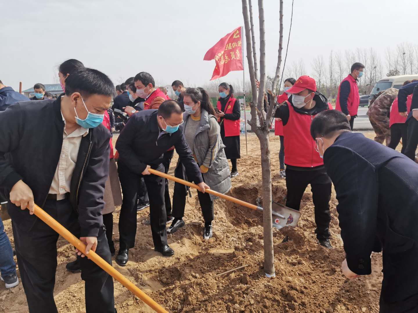 植樹現(xiàn)場(chǎng)到處是忙著植樹的人群,大家手扶樹苗,揮動(dòng)鐵锨,三五成隊(duì),勞動(dòng)場(chǎng)面繁忙而有序??h領(lǐng)導(dǎo)與廣大干部職工分組協(xié)作,熱情高漲、干勁十足,合力種下一棵棵樹苗。經(jīng)過一番熱火朝天的忙碌,一排排新栽的苗木迎風(fēng)挺立,為初春的扶溝增添了絲絲綠意。