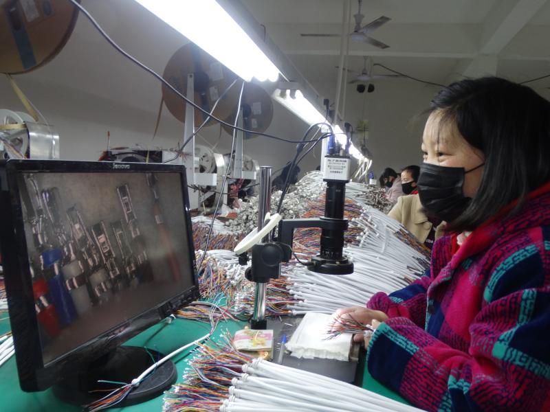 近日,沈丘縣周營(yíng)鎮(zhèn)眾邦電子來(lái)料組裝扶貧車間內(nèi),當(dāng)?shù)卮迕裼秒娔X檢驗(yàn)細(xì)微端子產(chǎn)品質(zhì)量。