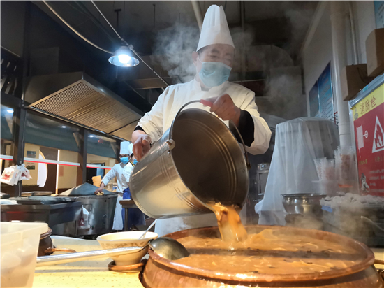 當(dāng)日凌晨3時30分,記者趕到這家早餐店,這里已是燈火通明,廚師和員工經(jīng)過測溫消毒后開始了一天繁忙的工作?!半m然現(xiàn)在允許堂食了,但我們的防控工作依然沒有放松,認(rèn)真做好每一位食客的測溫和登記工作?!痹摰杲?jīng)理王艷告訴記者,他們是昨天接到縣食品藥品監(jiān)督部門允許堂食的通知,隨后,他們對店面進(jìn)行了全面消殺工作,并將餐桌撤掉一半,保持一米以上間隔距離。