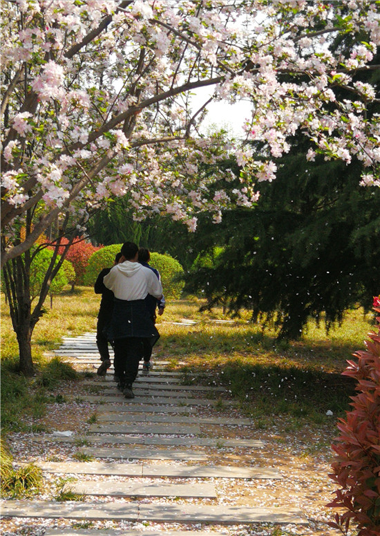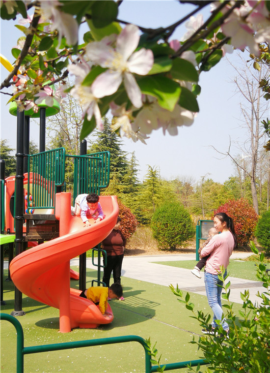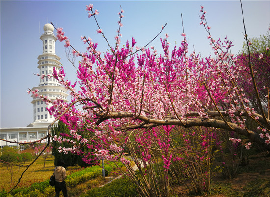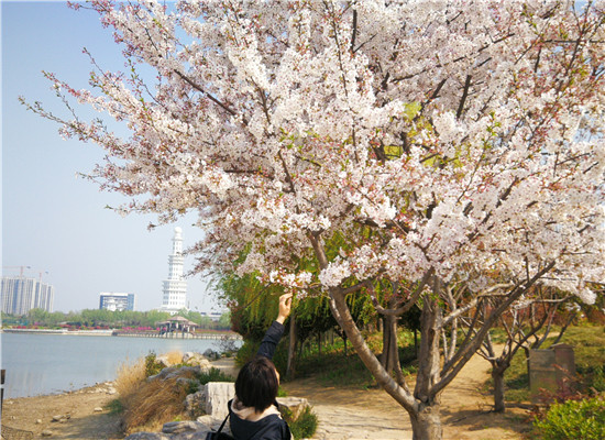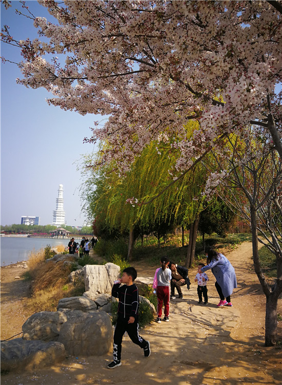 3月24日,周口公園內(nèi)櫻花、海棠、桃花、紫荊花爭(zhēng)相綻放,在綠樹(shù)的映襯下,遠(yuǎn)看猶如濃彩重墨的百花圖,不少市民來(lái)此賞花游玩。