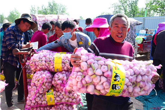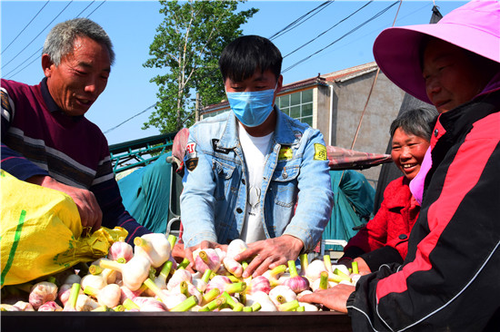 4月26日下午,記者在淮陽縣王店鄉(xiāng)107國道沿線看到,各個大蒜的收購點車來車往,蒜農(nóng)們拉著新蒜賣給小販們。盡管今年春季雨水較少,天旱土地墑情較差,但是上萬畝大蒜,在蒜農(nóng)們施肥澆水管理下,長勢不錯,每畝產(chǎn)量在3000斤到4000斤之間,迎來疫情下的大蒜豐收。