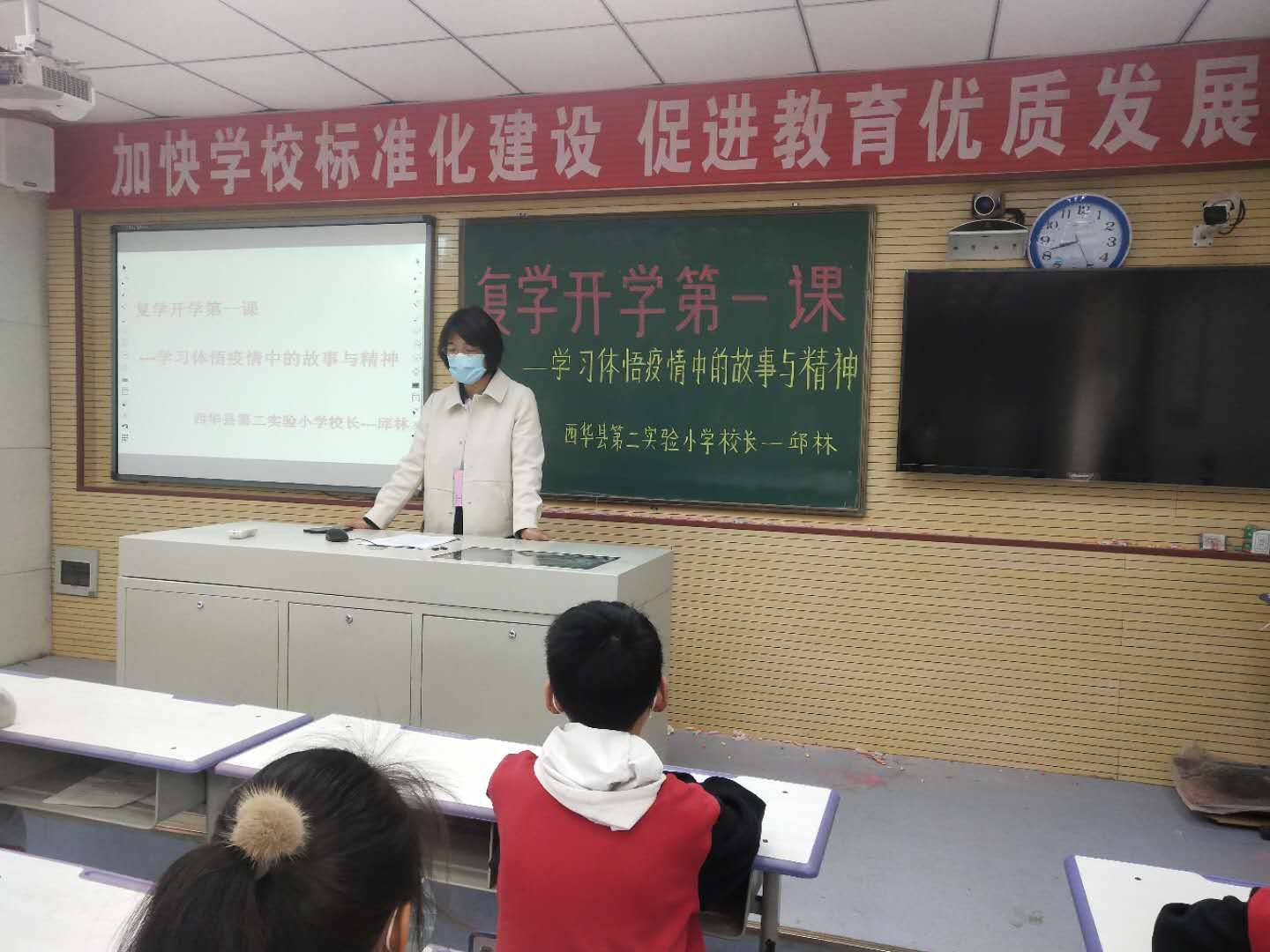 該校校長(zhǎng)邱林為全校4、5、6年級(jí)1千多名師生上復(fù)學(xué)第一課,重點(diǎn)講述疫情之中感動(dòng) 、疫情帶給我們的啟示。