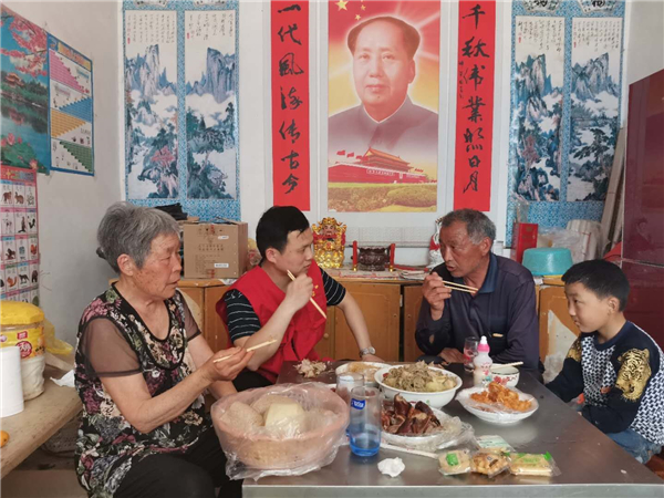 當(dāng)日,付留兵走進(jìn)廚房,拿起鍋鏟,俯下身子,炒起了大盤雞,經(jīng)過一個(gè)多小時(shí)忙活,熱騰騰的大盤雞端上了桌。大家圍坐在一起,邊吃邊聊,氣氛其樂融融。付留兵在飯桌上敞開心扉與貧困戶面對(duì)面交談,再次實(shí)地核對(duì)了貧困戶的基本信息和“兩不愁、三保障”等各項(xiàng)政策落實(shí)情況,進(jìn)一步發(fā)現(xiàn)問題、研究問題、解決問題。飯后,貧困戶龔興超的父親泛著感動(dòng)的淚光,拉著付留兵的手說:“今天的雞子真香,真的要感謝黨,感謝黨的精準(zhǔn)扶貧政策,讓我們更加堅(jiān)定了戰(zhàn)勝貧困的決心和信心!”