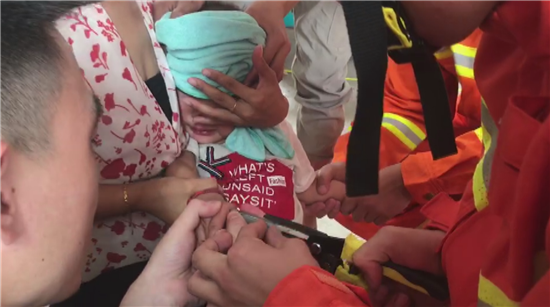6月8日,鄲城消防救援大隊接到群眾報警稱虎崗鄉(xiāng)郭集村顧莊2歲小男孩因?yàn)樨澩媸种副讳摴芴鬃∪〔幌聛恚埱髱椭?。接到報警后,鄲城縣消防救援大隊立即出動2輛消防車10名指戰(zhàn)員前往處置。