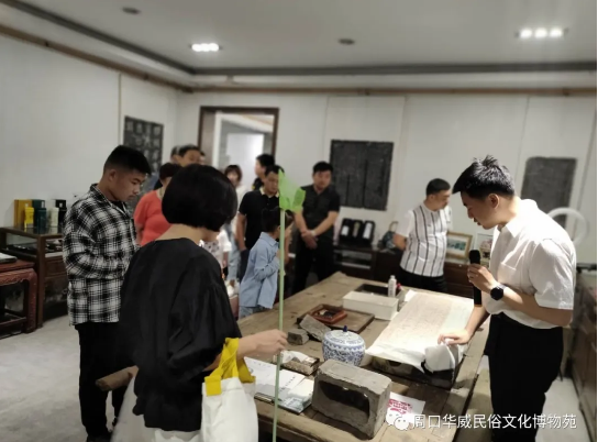 由于當天是禮拜六,孩子們和大人來的特別多,陸陸續(xù)續(xù),穿梭不停,其中最大的一個游客團由20多人,孩子們牽著大人的手,游百獅園,參觀華威綜合展廳的木質(zhì)榨油機和書畫,到華威學(xué)堂看拓片技藝,觀看香文化。