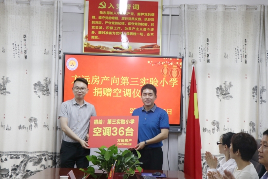 “方遠房地產(chǎn)公司為第三實驗小學(xué)捐贈空調(diào),大大改善學(xué)校的降溫條件,為孩子們營造更為舒適的學(xué)習環(huán)境?!钡谌龑嶒炐W(xué)校長王玉剛表示,學(xué)校將以此為契機,號召廣大學(xué)生好好學(xué)習,長大后回報社會;全校教職員工以優(yōu)異的教學(xué)業(yè)績回報社會,傳遞愛心,努力辦學(xué)生快樂、教師幸福、家長滿意的現(xiàn)代化學(xué)校。