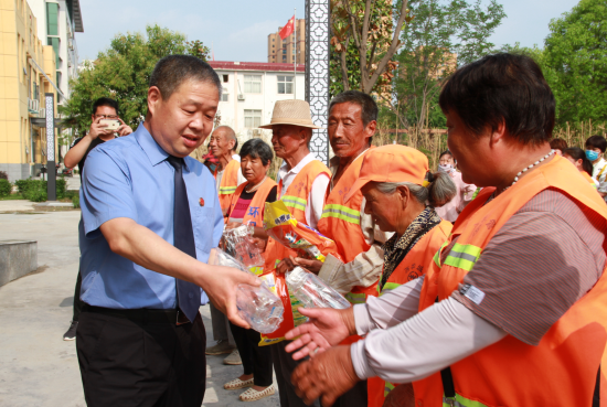 6月18日下午,西華縣檢察院黨組書記、檢察長鄭清朝帶領(lǐng)該院志愿者服務(wù)隊(duì)開展慰問環(huán)衛(wèi)工人志愿者活動(dòng),為775名環(huán)衛(wèi)工人送去毛巾、洗衣粉、香皂、水杯、礦泉水等價(jià)值近3萬元的慰問品,以此表達(dá)對普通勞動(dòng)者最真摯的關(guān)懷。