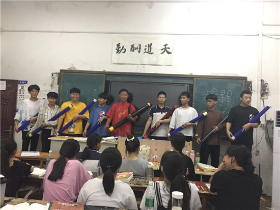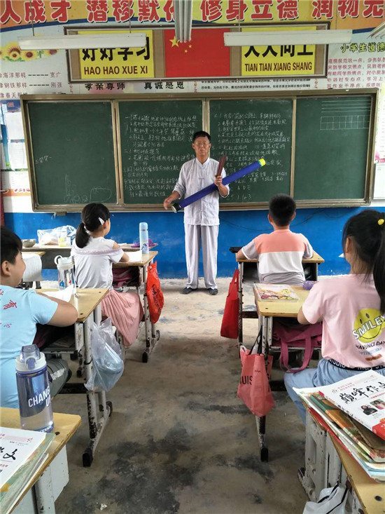 7月1日晚上,太康縣第二高級(jí)中學(xué)的一班學(xué)生們的音樂(lè)課,請(qǐng)來(lái)他傳授漁鼓道情,他領(lǐng)著學(xué)生們,排成一行,右手拍打道情筒,左手轉(zhuǎn)動(dòng),打起響板,這種獨(dú)特的藝術(shù)惹得學(xué)生娃們愛(ài)不釋手。在建黨日里,王在禮為學(xué)生娃們上了一堂精彩非遺藝術(shù)課。