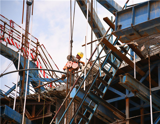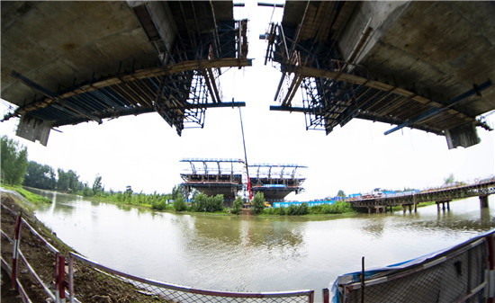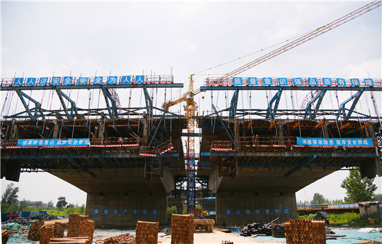 周口北環(huán)跨賈魯河大橋是我市在建重點(diǎn)工程,全長904米,其中主橋總長286米,共3跨,采用懸澆法施工。7月16日中午,記者在工地看到,經(jīng)過一年多的施工,工程完成80%左右,為了保障工期和質(zhì)量,工人們冒著酷暑,在跨河的兩列橋墩上,忙碌著澆鑄施工,隨著澆鑄橋體的延伸,預(yù)計(jì)年底橋體完成合攏。