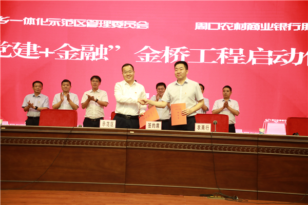 儀式上,盛毅、張建黨共同簽訂了《黨建+金融》共建協議。周口農商銀行監(jiān)事長陳德來宣讀了《周口市城鄉(xiāng)一體化示范區(qū).周口農商銀行關于共同加強基層黨組織建設踐行普惠金融服務鄉(xiāng)村振興的實施方案》。