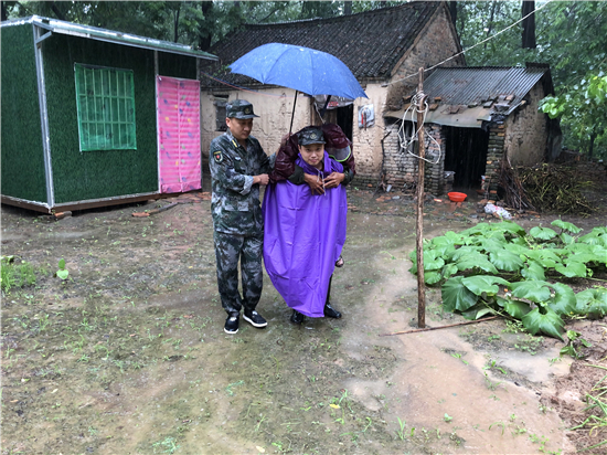 強(qiáng)降雨導(dǎo)致部分地勢較低的農(nóng)房及農(nóng)田被淹,在排查中,發(fā)現(xiàn)鄭老莊村幾處農(nóng)房被水淹泡,隨時有倒塌的危險,了解這一情況后,該鎮(zhèn)第八工作區(qū)區(qū)長、“中國好人”、優(yōu)秀退役軍人蔣昆立即組織鄭老莊村兩委人員及民兵應(yīng)急隊,第一時間趕到現(xiàn)場,轉(zhuǎn)移隱患點周圍住戶。“雨越來越大,你們這個屋今晚上不能住了,反正隨時都有倒塌的危險,把要緊的東西收拾一下,跟到我們走快點”蔣昆勸說鄭老莊村受災(zāi)的一名老大爺。