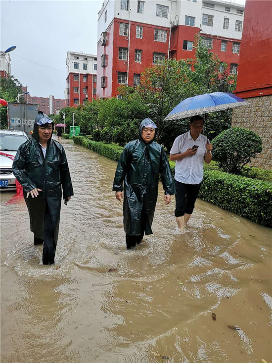 在未來家園小區(qū),孫紅偉一行涉水仔細查看小區(qū)積水情況。由于強降雨造成小區(qū)積水嚴重,居民出行困難,孫紅偉當即安排李埠口鄉(xiāng)負責人盡快組織人員設備排出積水,確保群眾生命財產(chǎn)安全。