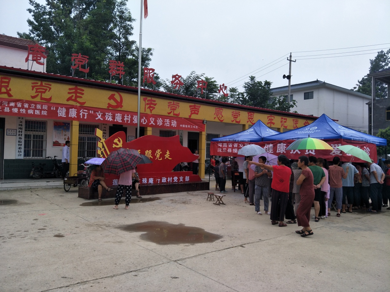 7月24日,天氣瀝瀝下著小雨,為關(guān)心關(guān)愛(ài)所駐村全體村民的身體健康,幫助群眾有疾病“早發(fā)現(xiàn)、早治療、早康復(fù)。中國(guó)信科集團(tuán)駐村第一書(shū)記王勇特邀請(qǐng)河南省省立醫(yī)院聯(lián)合沈丘縣慢性病醫(yī)院,組織高血壓、糖尿病、心血管內(nèi)科等慢性病科的10多名專家、護(hù)士,深入到對(duì)口幫扶的沈丘縣蓮池鎮(zhèn)文殊庵村開(kāi)展“健康行”扶貧愛(ài)心義診活動(dòng)。